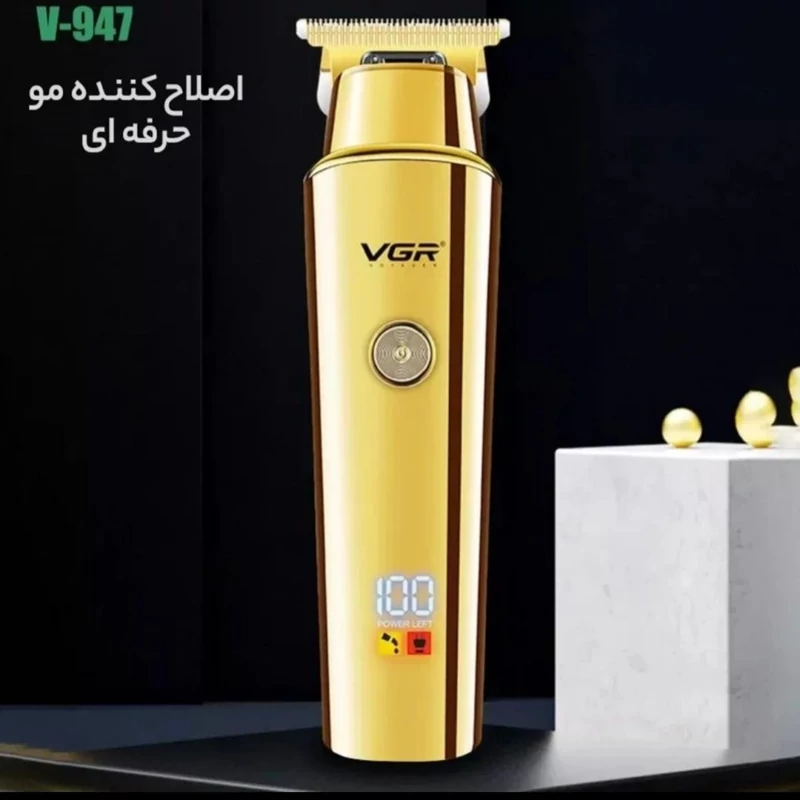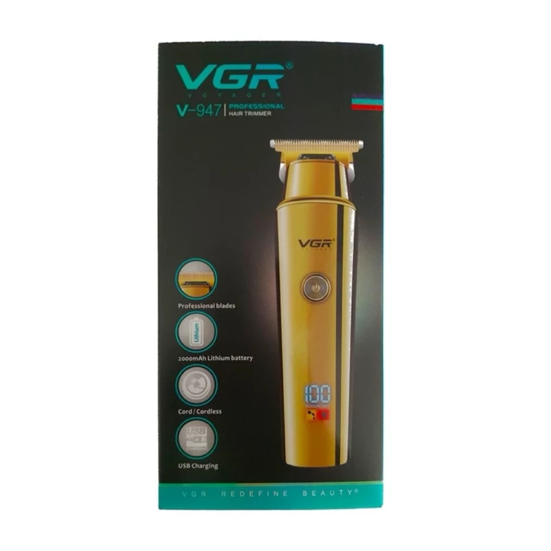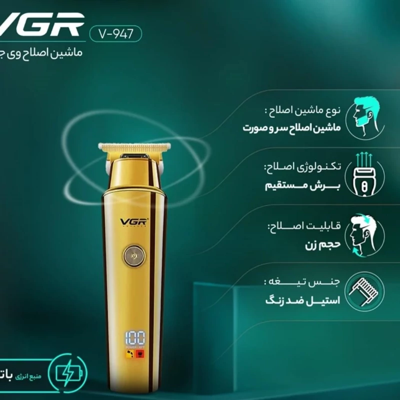 ماشین اصلاح وی جی ار مدل 947 یک ماشین اصلاح با کیفیت بسیار بالا و طراحی زیبا است. تیغه ماشین اصلاح وی جی ار مدل 947 از استیل ضد زنگ میباشد که این نمونه تیغه از کیفیت بسیار بالایی برخوردار است. منبع تغذیه ماشین اصلاح وی جی ار مدل 947 یک باتری قابل شارژ 2000 میلی امپر ساعت از نوع لیتیومی است که هم میتوان با سیم و بدون سیم از دستگاه استفاده کرد. با 4 ساعت شارژ دستگاه میتوان 500 دقیقه مداوم از ماشین اصلاح استفاده کرد. ماشین اصلاح وی جی ار مدل 947 دارای صفحه نمایشگر ال ای دی است که درصد شارژ را نشان میدهد.اقلام همراه ماشین اصلاح وی جی ار مدل 947 اعم از 3 شانه تنظیم کننده به شماره ای 1.5 - 3 - 4.5 ، درپوش محافظ تیغه ، روغن ، برس تمیز کننده ، کابل شارژ یو اس بی است.